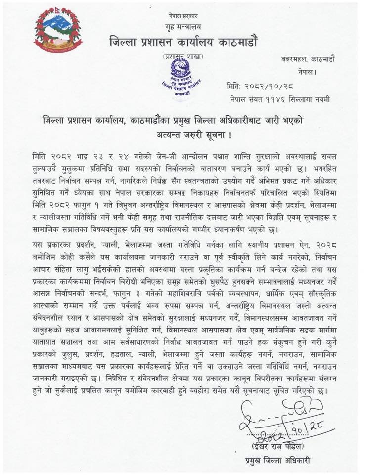भदौ २३ र २४ गतेको जेन जी आन्दोलनका कारण हुन लागेको प्रतिनिधि सभाको निर्वाचनको वातावरण विथोलिन सक्ने र निर्वाचन आचारसंहिता समेत लागू भइसकेकाले प्रदर्शन गर्न नदिने प्रशासनले बताएको छ।